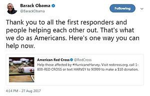 While Obama was not in Texas serving food, he did tweet a link to the American Red Cross on Sunday encouraging people to help.