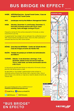 Beginning Saturday, Dec. 16, 2017, METRO will modify rail service on the Red Line in order to allow Midtown Management District work crews to complete landscape enhancements along the corridor.