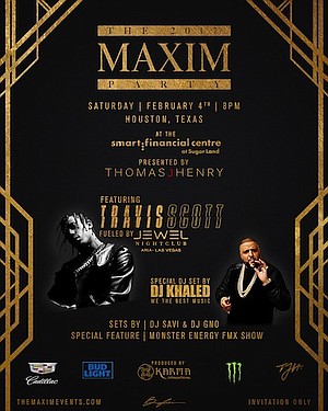 This year, The MAXIM Party 2017 is taking place at the Smart Financial Centre – a state-of-theart, brand-new facility in the greater Houston area, accommodating over 4,000 tastemakers and VIP’s. The exclusive affair, produced by Karma International, has an outstanding talent line up, featuring hip hop recording artist Travis Scott, a deejay set by DJ Khaled, strolling performers, aerialists and more. Art, fashion, music and sports will all simultaneously collide for the ultimate immersive and exciting party experience, which will include multiple interactive areas, live artistic vignettes, theatrical lighting and concert level sound. Table buyers and celebrities will have beautiful, spacious, all-inclusive suites and tables on risen platforms overlooking the decadent and exclusive affair.