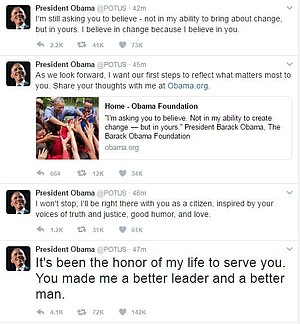 WASHINGTON (CNN) -- President Barack Obama tweeted the American people in his final hours as head of state promising to continue his work with them, and unveiling a new website.