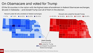Life in Grant County, population 641, could not be more different than the gilded Big Apple existence long enjoyed by President Donald Trump. Still, it ranked among the top counties in the country supporting him in November; he got more than 93% of the votes here. And yet Grant holds another distinction: It's the county with the highest percentage of Obamacare enrollees in the nation.
