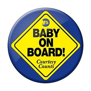 The MTA has begun issuing blue and yellow "Baby on Board" buttons as part of the agency's Courtesy Counts campaign to encourage strap-hangers to be polite to their fellow riders.