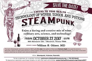Cheers to Your Health: STEAMPunk will take place at The Health Museum, located at 1515 Hermann Drive, Houston, Texas, 77004, on Friday, October 27, 2017 from 6 p.m. to 9 p.m. and will feature an evening of libations and savory culinary treats from local eateries, restaurants, and farmer’s markets. The event also will explore the technology of wines, tonics and potions.