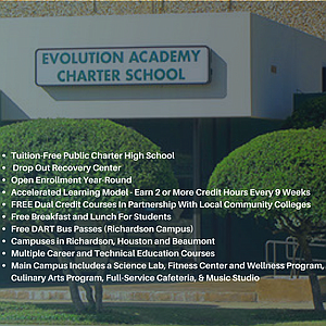 Evolution Academy has campuses in Dallas, Beaumont and Houston, Texas and has open enrollment year-round on all three campuses. Students can enroll online at www.evolutionacademy.org or visit one of the campuses to enroll in person. The main campus in Dallas includes a science lab, fitness center and wellness program, piano lab, culinary arts program, full-service cafeteria and a state-of-the-art music studio where students can write, record and produce music.