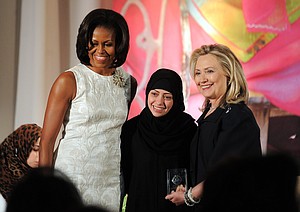 Former US Secretary of State Hillary Clinton and first lady Michelle Obama presented Badawi with the US Secretary of State's International Women of Courage Award in 2012 for her advocacy work.