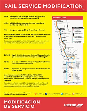 Beginning Saturday, Aug. 11, 2018, METRO will modify rail service on the Red Line to allow City of Houston work crews to complete emergency repairs to a downtown water main.