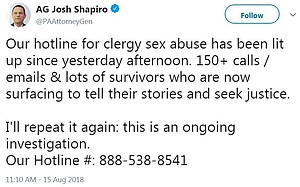 State Attorney General Josh Shapiro called on church leaders to support the report's recommendations "so that survivors have the opportunity to obtain justice." He also said his office's hotline and email accounts have "lit up" with calls and messages from reported abuse survivors since the grand jury report was published.