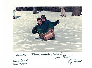 In an interview Sunday on CNN's "State of the Union," anchor Jake Tapper asked Schwarzenegger about a photo of him and the 41st president on a toboggan at the presidential retreat, and the actor and former California governor recounted things this way: "It was snowing up there, and we had this toboggan, and (Bush) was trying to teach me how to slide that because I was only used to sledding down with Austrian sleds, which you direct kind of with your feet. And so we went down totally out of control, and of course we crashed into Barbara Bush, who broke her leg then after that. So that's why he sent me this picture."