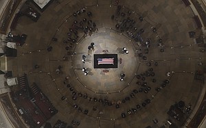 "Briefed in 2011 about his funeral and lying in state, the 41st President asked with typical humility, 'Do you think anyone will come?' Tonight, people are waiting hours to pay their respects. This photo, taken Monday, is courtesy the Senate Press Photographers' Gallery pool," tweeted Bush spokesman Jim McGrath, who included a picture of the crowd surrounding Bush's casket as he lay in state at the Capitol Rotunda.