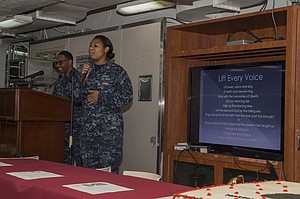 SOUTH CHINA SEA (Feb. 7, 2018) Aviation Machinist's Mate 1st Class Rhea Dias, from Mandeville, Jamaica, sings "Lift Every Voice" during an African American/Black History Month celebration on the mess decks of the amphibious assault ship USS Bonhomme Richard (LHD 6). Bonhomme Richard is operating in the Indo-Asia-Pacific region as part of a regularly scheduled patrol and provides a rapid-response capability in the event of a regional contingency or natural disaster. (U.S. Navy photo by Mass Communication Specialist 2nd Class Kyle Carlstrom/Released)