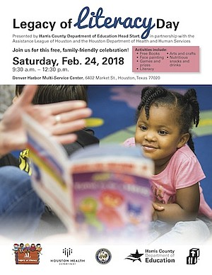 Feb. 19, 2018 - Families are invited to the Legacy of Literacy Day event on Saturday, Feb. 24 from 9:30 a.m. – 12:30 p.m. at 6402 Market St. for free books, games and prizes, arts and crafts, face painting and more. Harris County Department of Education Head Start, the Assistance League of Houston and the Houston Department of Health and Human Services host the event. View the event flyer: http://www.hcde-texas.org/media/5199/headstart_legacyofliteracy.pdf .