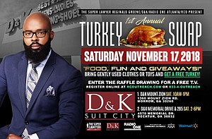 October 25, 2018- Atlanta, GA - On Saturday, November 17th, 2018 Restoration Community Outreach (RCO) in collaboration with Reginald Greene, ESQ (The Super Lawyer), Radio One, and D & K Suit City, will host the 2nd Annual Turkey Swap. Officially sponsored by Walmart and Decatur Atlanta Printing, the event will take place at two separate locations with the first being D & K Mount Zion ( 1360 Mount Zion Road, Morrow, GA 30260) which will be held from 10:00 am until 1:00 pm. It will then move to D & K Memorial Drive and l-285 (4570 Memorial Dr, Decatur, GA 30032) which will be held from 2:00 pm until 6:00 pm. The aim of The Turkey Swap is to help Atlanta's homeless and underserved by giving away Turkeys to those in need this holiday season. Last year the partnering organizations were able to provide turkeys to over 1000 attendees. This year, with the help of the entire Atlanta community and news media outlets, The Second Annual Turkey Swap will assist all in need.