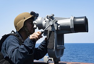 1904119-N-XN169-1031 MEDITERRANEAN SEA (April 19, 2019) Culinary Specialist 1st Class Samuel Villarreal, from Houston, Texas, uses binoculars while standing watch during a combat systems drill aboard the Arleigh Burke-class guided-missile destroyer USS Mason (DDG 87). Mason is underway as part of Abraham Lincoln Carrier Strike Groupâs (ABECSG) deployment in support of maritime security cooperation efforts in U.S. 5th, 6th and 7th Fleet areas of responsibility. With Abraham Lincoln as the flagship, deploying strike group assets include staffs, ships and aircraft of Carrier Strike Group 12 (CSG 12), Destroyer Squadron 2 (DESRON 2), USS Leyte Gulf (CG 55) and Carrier Air Wing 7 (CVW 7). (U.S. Navy photo by Mass Communication Specialist 3rd Class Lasheba James/Released)