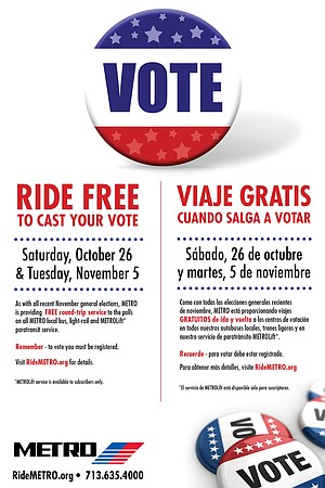 As with all recent November general elections, METRO is providing complimentary trips to polling locations in our service area. Voters can ride at no charge on METRORail, local buses, and METROLift.