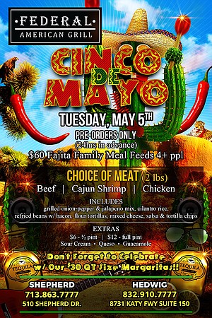 Matt Brice, owner of The Federal American Grill, 510 Shepherd Drive (77007) and the newly opened 8731 Katy Freeway, Suite 150 (77024) will re-open the Shepherd Drive location on Friday, May 1 at 11AM serving lunch and dinner.