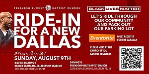 This Sunday, August 9, 2020 there will be a Black Lives Matter “Ride-In for a New Dallas.” Starting at 8:30 a.m. at the Barack Obama Male Leadership Academy (3030 Stag Road, Dallas, Texas 75241), the caravan will drive through Oak Cliff and end at Friendship-West Baptist Church (2020 W. Wheatland Road, Dallas, TX 75232). The event is open to public supporters and those who plan to participate in the caravan are asked to register via Eventbrite. Others who wish to support are encouraged to meet in the church parking lot at 9:45 a.m.