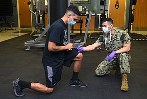 Hospital Corpsman 2nd Class David Phan, from Houston, Texas, helps to rehabilitate Boatswain's Mate 1st Class Leo Torres Teruel, a sailor assigned to the littoral combat ship USS Detroit (LCS 7), at Naval Hospital Jacksonville's physical therapy department. The Navy Hospital Corps celebrates 122 years of service on June 17. Hospital corpsmen take a pledge to faithfully perform all of their duties, to hold the care of the sick and injured to be a privilege and a sacred trust, and assist the medical officer with loyalty and honesty. (U.S. Navy photo by Jacob Sippel, Naval Hospital Jacksonville/Released)