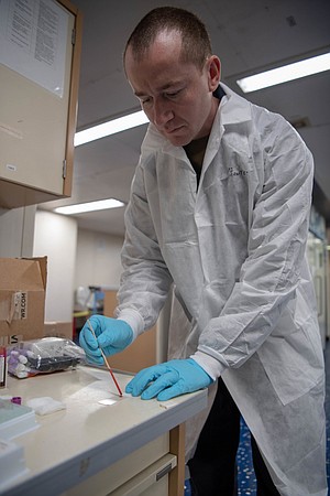 200326-N-VI515-1022 PACIFIC OCEAN (March 26, 2020) Hospital Corpsman 2nd Class Jesús Montes, from Houston, places a blood sample on a test slide for microscopic staining aboard Military Sealift Command hospital ship USNS Mercy (T-AH 19) March 26. Mercy deployed in support of the nation’s COVID-19 response efforts, and will serve as a referral hospital for non-COVID-19 patients currently admitted to shore-based hospitals. This allows shore base hospitals to focus their efforts on COVID-19 cases. One of the Department of Defense’s missions is Defense Support of Civil Authorities. DoD is supporting the Federal Emergency Management Agency, the lead federal agency, as well as state, local and public health authorities in helping protect the health and safety of the American people. (U.S. Navy photo by Mass Communication Specialist 2nd Class Erwin Jacob Miciano)
