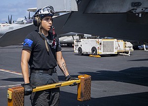 ARABIAN SEA (March 27, 2020) Airman Ramiro Fuentes, from Houston, follows an F/A-18 Super Hornet with a chock on the flight deck of the aircraft carrier USS Harry S. Truman (CVN 75) in the Arabian Sea March 27, 2020. The Harry S. Truman Carrier Strike Group is deployed to the U.S. 5th Fleet area of operations in support of naval operations to ensure maritime stability and security in the Central Region, connecting the Mediterranean and the Pacific through the Western Indian Ocean and three strategic choke points. (U.S. Navy photo by Mass Communication Specialist Seaman Kelsey Trinh)