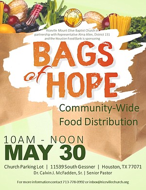 Riceville Mount Olive Baptist Church (located at 11539 S. Gessner in Southwest Houston) will partner with State Representative Alma Allen (D131) and other local officials to provide over 600 boxes and bags of food for area residents on Saturday May 30th. Families will be able to drive through the Church’s parking lot to receive a “Bag of Hope” beginning at 10AM.