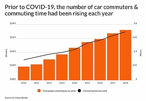 Additionally, the total number of people commuting by car has grown over the past ten years, reaching almost 118 million in 2018. Before COVID-19, about three-quarters of workers drove to work alone—the mode of transportation that is perhaps least conducive to multitasking.