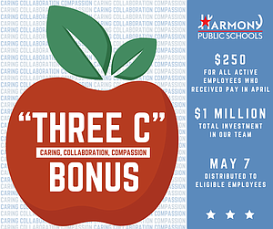 Dubbed a "Three C" bonus for the "Caring, Collaboration and Compassion" Harmony team members have demonstrated in helping students and their fellow teammates excel despite the challenges of a COVID school year, the bonus was passed unanimously by the Harmony Executive Board of Directors during the April 24 HPS board meeting.