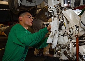 PHILIPPINE SEA (Dec. 6, 2021) Aviation Electrician’s Mate Airman Lopez Cervantes, a native of Houston, conducts maintenance in the hangar bay of Nimitz-class aircraft carrier USS Carl Vinson (CVN 70), Dec. 6, 2021. Carl Vinson Carrier Strike Group is on a scheduled deployment in the U.S. 7th Fleet area of operations to enhance interoperability through alliances and partnerships while serving as a ready-response force in support of a free and open Indo-Pacific region. (U.S. Navy photo by Mass Communication Specialist Seaman Apprentice Micheal Mensah)