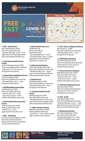 The department will also provide drive thru, self-nasal swab testing at the METRO Addicks Park & Ride, 14230 Katy Freeway, and the Multicultural Center, 951 Tristar Drive, city of Webster. Appointments are available by calling the department's Call Center.