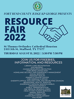 Fort Bend County Judge KP George will host a Free Community Resource Fair on Thursday, August 11, from 5:30 p.m. – 7:30 p.m. at St. Thomas Orthodox Cathedral Houston, 2411 5th Street, TX 77477.