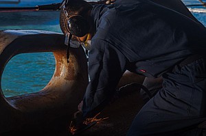 221128-N-JU916-1038 NORFOLK, Va. (Nov. 28, 2022) Seaman Allen Amarion, from Houston, sands the deck of the Nimitz-class aircraft carrier USS Harry S. Truman (CVN 75), November 28, 2022. Truman is the flagship of the Harry S. Truman Carrier Strike Group and is currently in port onboard Naval Station Norfolk. (U.S. Navy photo by Mass Communication Specialist Seaman Casey Iwuagwu)