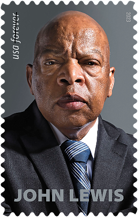 This stamp celebrates the life and legacy of civil rights leader and U.S. Rep. John Lewis (1940-2020) of Georgia. Devoted to equality and justice for all Americans, Lewis spent more than 30 years in Congress steadfastly defending and building on key civil rights gains that he had helped achieve in the 1960s. Even in the face of hatred and violence, as well as some 45 arrests, Lewis remained resolute in his commitment to what he liked to call “good trouble.” The stamp features a photograph of Lewis taken by Marco Grob on assignment for the Aug. 26, 2013, issue of Time magazine. The selvage showcases a photograph of Lewis taken by Steve Schapiro in 1963 outside a workshop about nonviolent protest in Clarksdale, MS. Derry Noyes served as art director for this project.