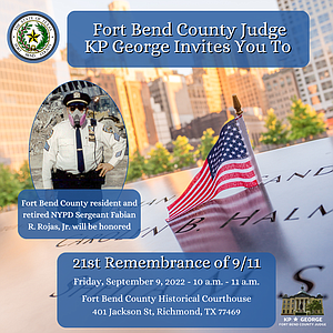 During the annual remembrance ceremony, Judge George will recognize Fort Bend County resident and retired NYPD Police Sergeant Fabian Rojas Jr., who served as a First Responder performing security, search, and rescue at Ground Zero after the attack on the World Trade Center in Manhattan, New York.