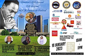 This year, the Black Heritage Society has selected Houston Mayor Sylvester Turner to serve as Grand Marshal. The Co-Grand Marshals are Rev. Dr. Derek King, nephew of Dr. MLK Jr., Dr. Camille Cash, Houston Plastic Surgeon, and a Memorial Tribute to the Late John Bland!