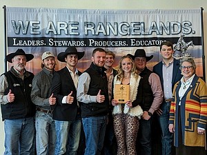 Members of the Texas A&M Range Club earned fourth place in the Undergraduate Range Management Exam among other accomplishments. L to R: Steven Evans, Steven Lovelace, Christophe Peralt, Garrett Seeger, Luke Novicke, Karlie Marek, Conner Himly, Cameron Sheffield, Karen Launchbaugh, Ph.D., president of the Society for Rangeland Management. (Photo courtesy Steven Evans)