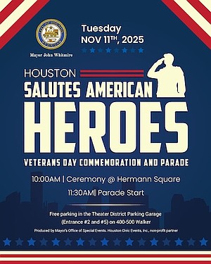 Mayor John Whitmire is inviting Houstonians to join the City of Houston in honoring the brave men and women who have served and sacrificed for our nation. The City’s annual Veterans Day Parade and Program will take place on Tuesday, November 11, 2025, as part of the “Houston Salutes American Heroes” celebration.