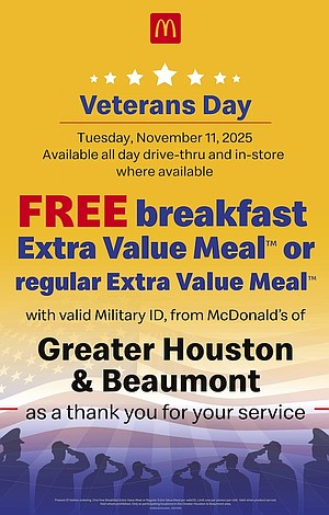 In recognition of Veterans Day, Tuesday, November 11, 2025, McDonald’s restaurants across the Greater Houston area will honor military servicemen and servicewomen with a free breakfast or regular Extra Value Meal. The gesture is part of the brand’s continued commitment to celebrating those who have served and sacrificed for the nation.