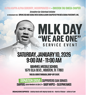 Presented in partnership with Spring Independent School District and Phi Beta Sigma Fraternity, Inc., Sigma Theta Sigma Chapter, the MLK Day of Service aligns with the national observance of MLK Day as “a day on, not a day off,” encouraging hands-on community engagement and unity through action.