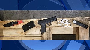 A realistic-looking replica firearm, metal knuckles and a knife were seized as evidence after the 15-year-old boy was detained.
