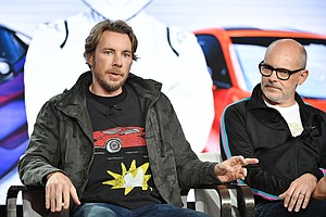 The "Top Gear America" star clipped a bumper, went flying over the handlebars and landed hard.