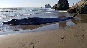 BANDON, OR (KPTV) -- A stranded 38-foot whale died on the Oregon coast south of Bandon on Saturday.