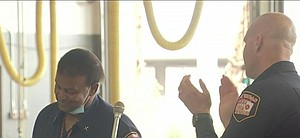 The gathering in the truck bay on Monday brought together friends, family and coworkers recognizing Las Vegas Fire and Rescue Battalion Chief Lawrence Wickliffe.