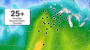 Minneapolis, Minnesota, is forecast to reach a high of 68 on Tuesday, breaking its old record of 61 that dates back to 1879. Fargo, North Dakota, could even break a record. The temperature should reach 65 on Tuesday, breaking a record of 58.