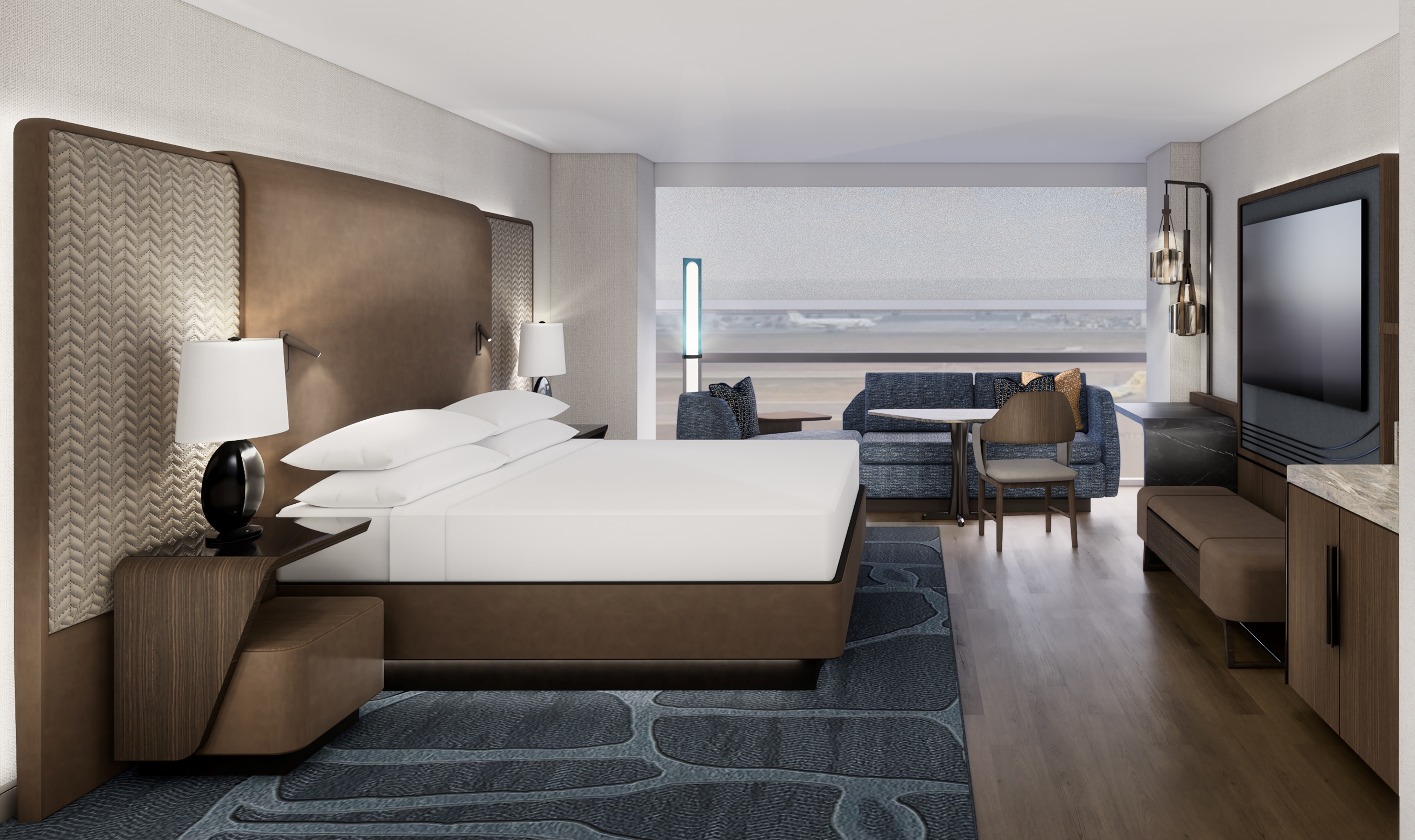 The hotel’s design evolution blends aeronautical inspiration with elements reflecting the Texas landscape. The redesigned lobby features marble flooring, dramatic ceilings with accent lighting, and artwork by local artists. Guestrooms and suites will increase from 298 to 315, featuring a palette of subdued greens and natural blues inspired by the Texas western prairies. Updated rooms will include modern bathrooms with larger vanities, showers, and soaking tubs, along with smart technologies like automatic blackout shades and runway-view windows.