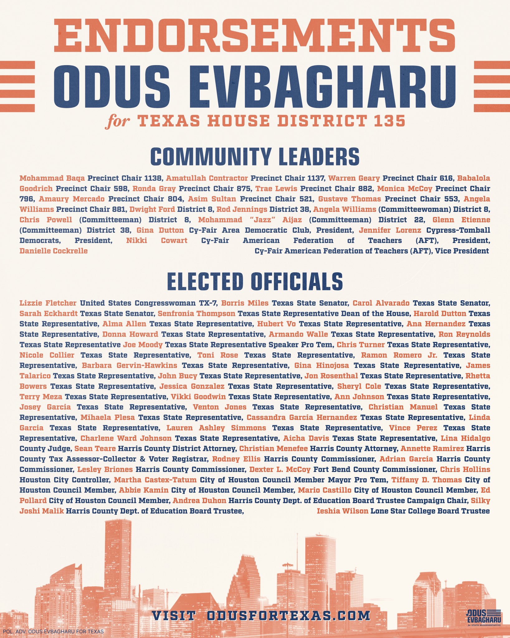Odus Evbagharu’s campaign for Texas House District 135 has gained support from over 80 community leaders, precinct chairs, and elected officials, including more than half of the Texas House Democratic Caucus. The endorsements reflect a broad coalition backing Evbagharu as he seeks to represent the district in northwest Harris County.