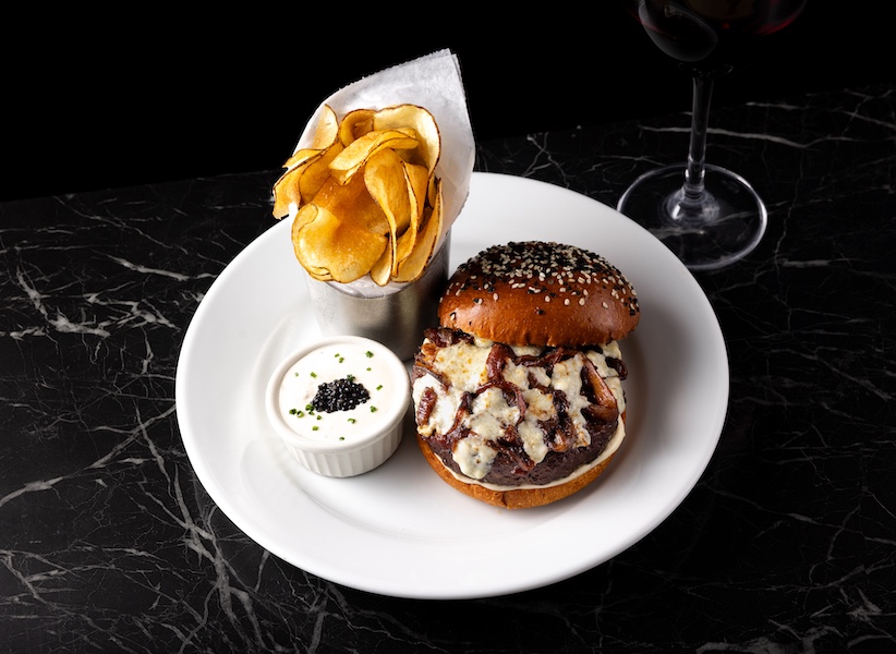 Each burger is served with gourmet fries, though those looking to splurge can opt for the Chips & Caviar upgrade—housemade chips with caramelized onion and caviar dip—for an additional $20.
