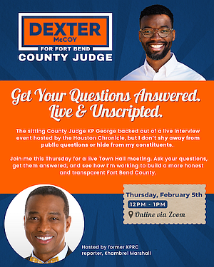 Fort Bend County Precinct 4 Commissioner Dexter McCoy released a statement criticizing County Judge KP George for withdrawing from a live candidate forum scheduled for Feb. 5 and hosted by the Houston Chronicle. McCoy said the cancellation prompted him to organize a separate online town hall to engage directly with voters.