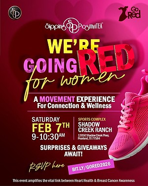 Sipping PositiviTEA will host the Go Red for Heart Disease, a free, community-centered wellness event designed to encourage movement, connection, and preventative health awareness for women and men. All fitness levels are invited to the Go Red for Women event a dance fusion for all to come as they are and move at their own pace in support of heart health and overall wellness. The Go Red event will take place on Saturday, February 7, from 9:00 a.m. to 10:30 a.m. at the Sports Complex at Shadow Creek Ranch, 13050 Shadow Creek Parkway, Pearland, Texas 77584. Participation is free, but RSVPs are required.